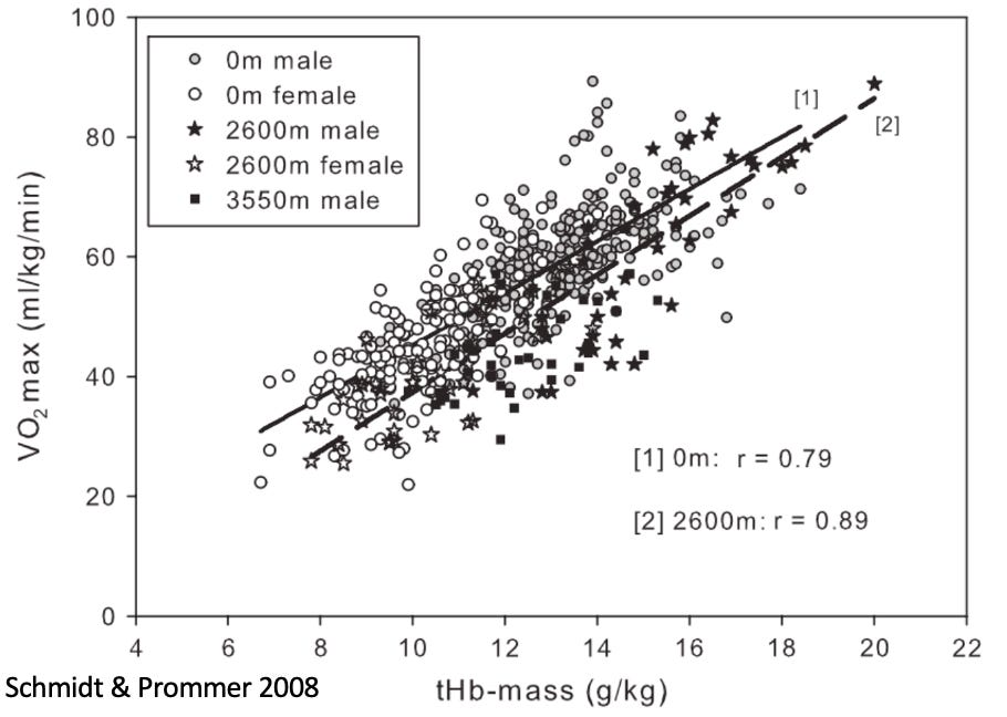 Hoogtetraining wordt toegepast voor prestatieoptimalisatie op zeeniveau (< 1,250m) en als acclimatisatiestrategie voor prestaties op hoogte (> 1,250m). De rationale om hoogte in te lassen ter voorbereiding van prestaties op zeeniveau ligt vooral in de toename aan hemoglobine (Hb). Hb is een gespecialiseerd eiwit dat zuurstof (O2) en koolstofdioxide (CO2) transporteert in het bloed. Een verhoogde Hb betekent dus meer circulatie van O2. Het belang daarvan kan niet onderschat worden en wordt geïllustreerd door de sterke correlatie tussen Hb en de en VO2max (zie onderstaande figuur, Schmidt & Prommer, 2008).