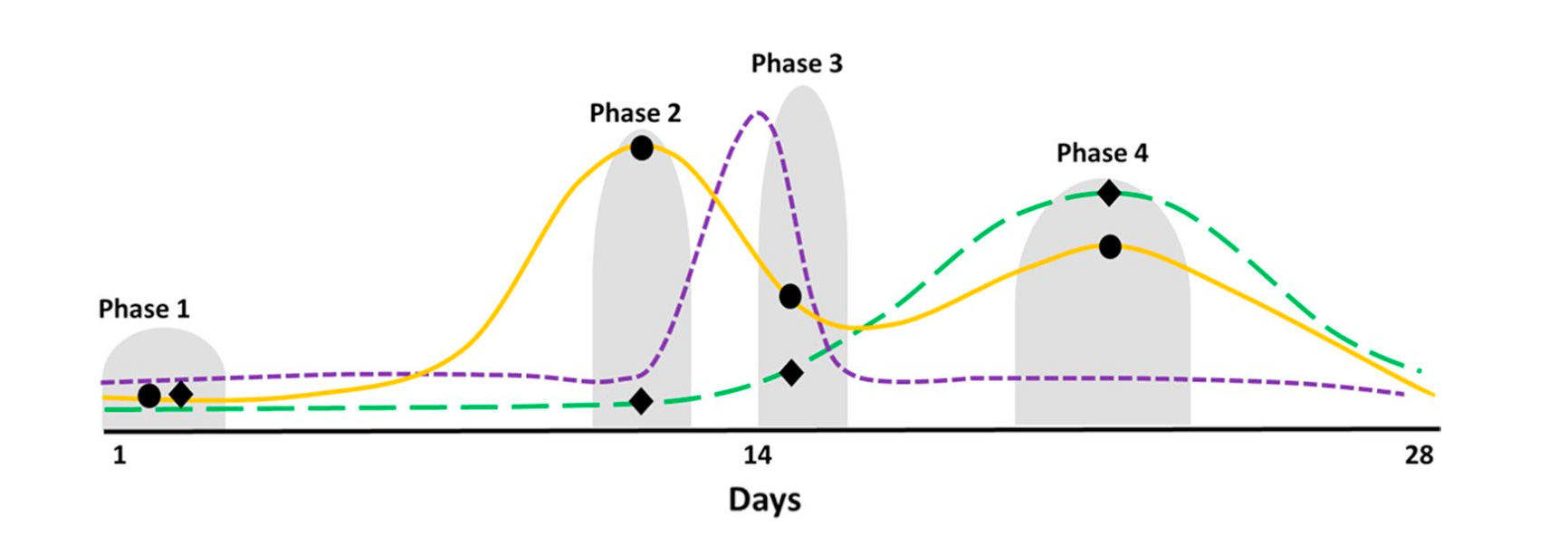 De MC is het onderdeel van het normale bioritme bij vrouwen tijdens de vruchtbare leeftijd. Tijdens de MC schommelen de ovariumhormonen oestrogeen en progesteron in een voorspelbaar, herhalend patroon, zoals weergegeven in de onderstaande figuur. Het is echter belangrijk op te merken dat er een grote inter- en intra-individuele variatie bestaat in zowel de cycluslengte als de hormoonniveaus.