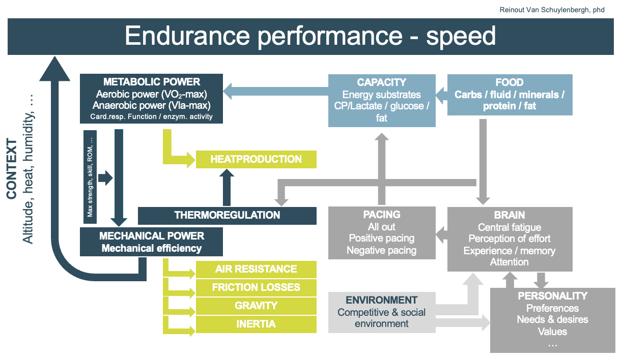 We benaderen een sportprestatie vanuit een holistisch denkkader. Het onderstaande schema geeft een beeld hoe we naar uithoudingssporten kijken. Een prestatie is niet het resultaat van een of enkele kenmerken, maar van de persoon met alle kwaliteiten die deze kan aanbrengen. We houden ons ver weg van ‘slogan-prestatiepredictie’, zoals vanuit het populaire FTP-denkkader. We kijken verder en grondiger naar wat nodig is om de prestatieambities te bereiken, wat de kwaliteiten van de persoon zijn en waar er marge is voor optimalisatie.