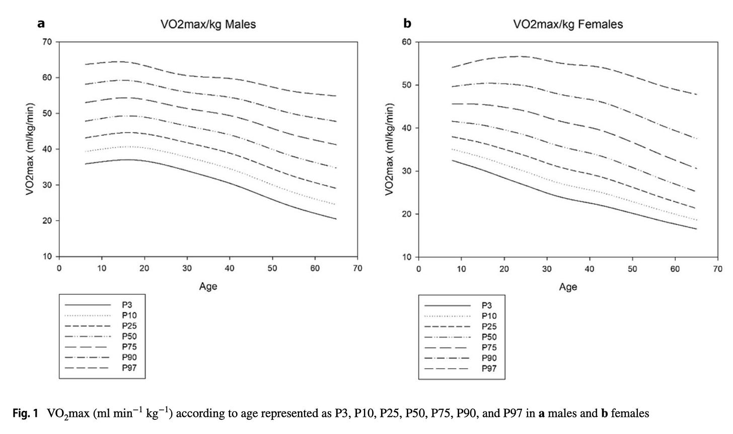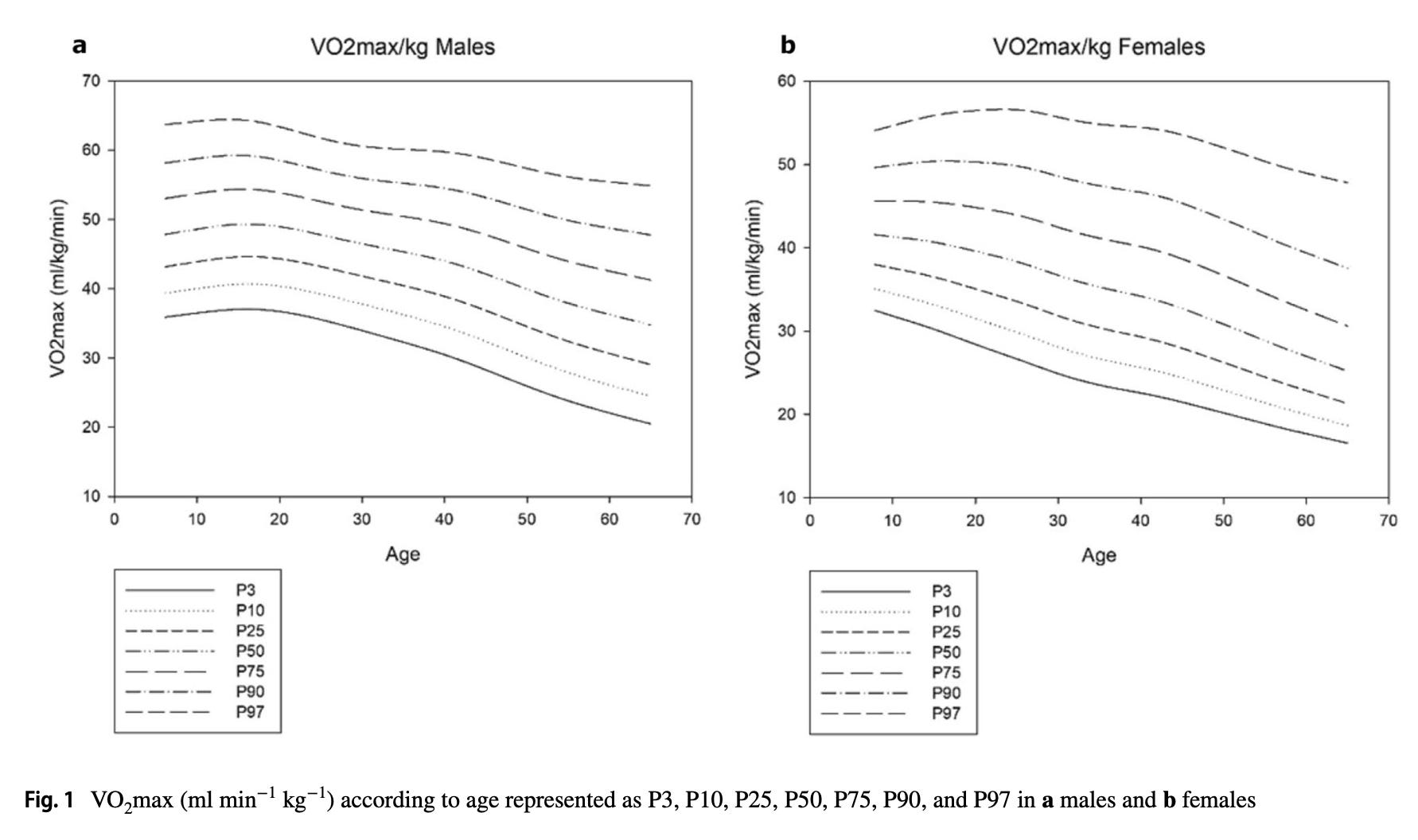 De VO2max wordt als een gouden standaard voor de cardiorespiratoire fitness gezien. Het belang van de VO2max is al decennia lang het voorwerp van wetenschappelijk onderzoek, zowel met een blik op gezondheid, trainingsadaptatie en als de sportprestatie. Om VO2max waarden goed te kunnen interpreteren zijn referentiegegevens van goudwaarde. In deze studie stelden de onderzoekers referenties op voor gezonde personen van 6-65 jaar.