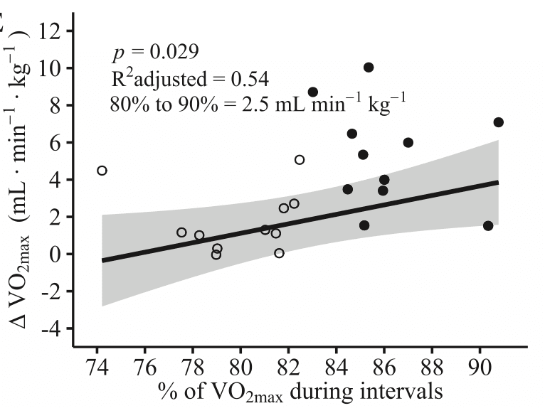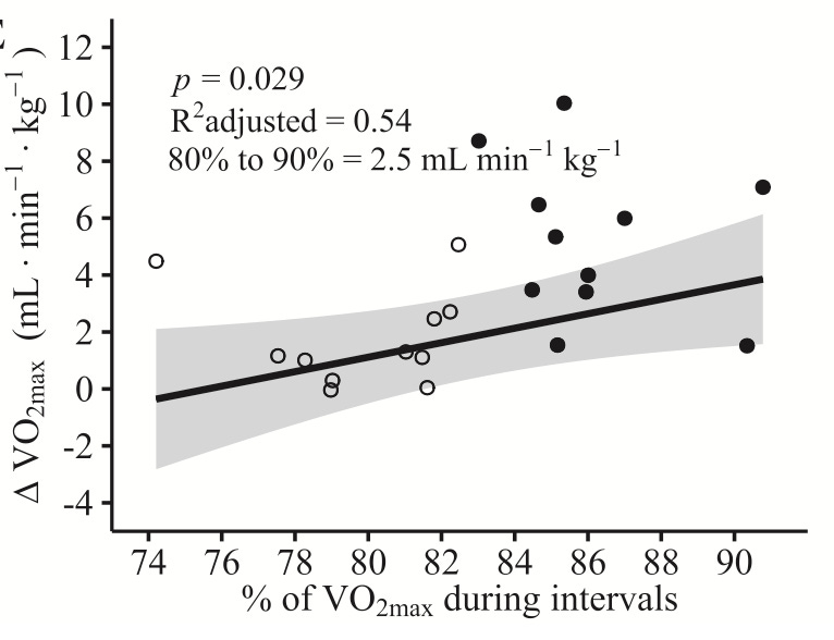 De studie toont aan dat wielrenners die (bij een vergelijkbaar relatief vermogen) een hoger percentage van hun VO₂max bereikten tijdens de intervallen, ook de grootste prestatiewinst boekten: