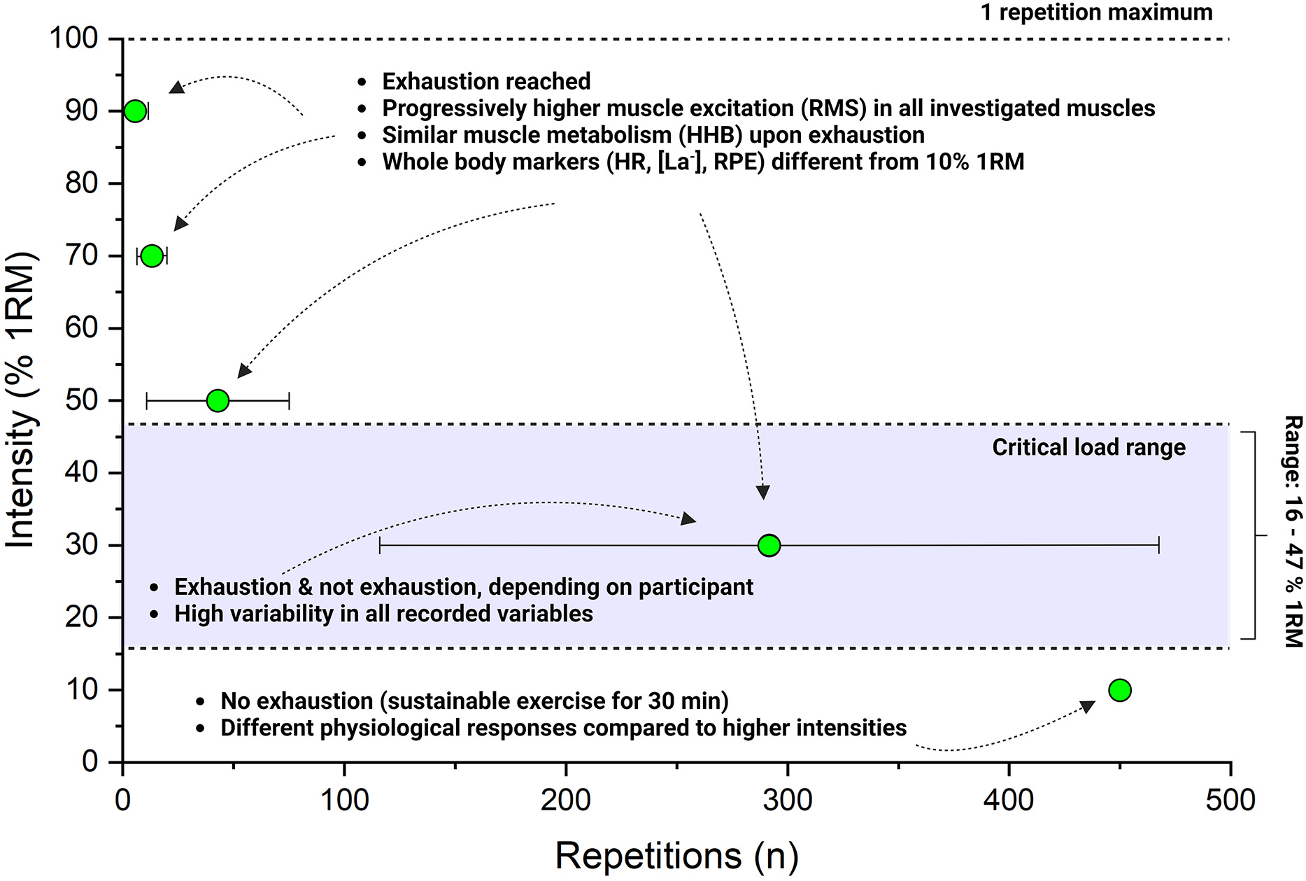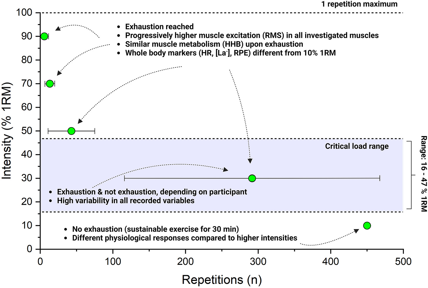 De drempelwaarde: De “Critical Load” werd vastgesteld op gemiddeld 31,7% van het 1RM.